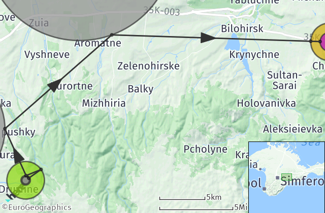 UTM 36 T 676812 4986859. Overall distance from Simferopol – 110 km. There are alternative routes – at the entrance to the Crimea from the north, in Djankoy there is a left turn to Feodosia, at the entrance to the Crimea from the east – you can drive by road Kerch - Simferopol.