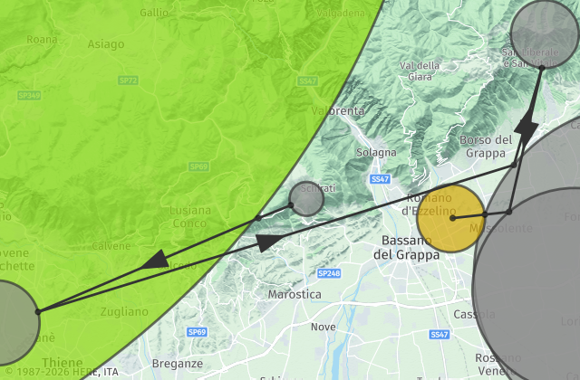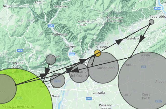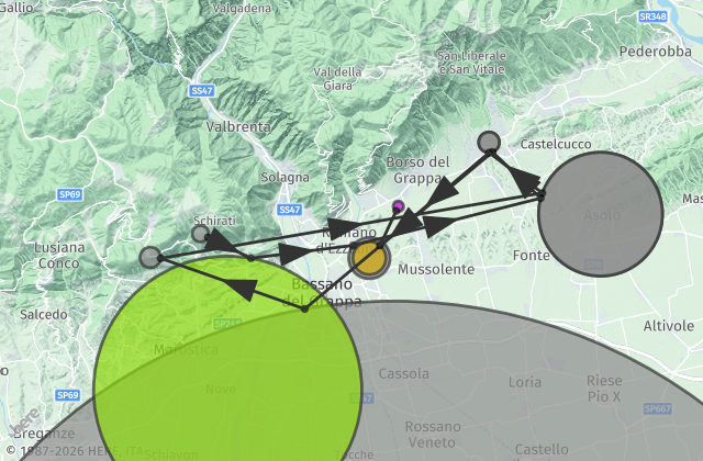 From Udine/Trieste follow A4/E70, take the A28 exit toward Portogruaro/Pordenone, take the exit onto A27 toward Venezia, take exit Treviso Nord, continue onto Superstrada Pedemontana Veneta, take the exit Bassano Est - Rosà and proceed north on SS47