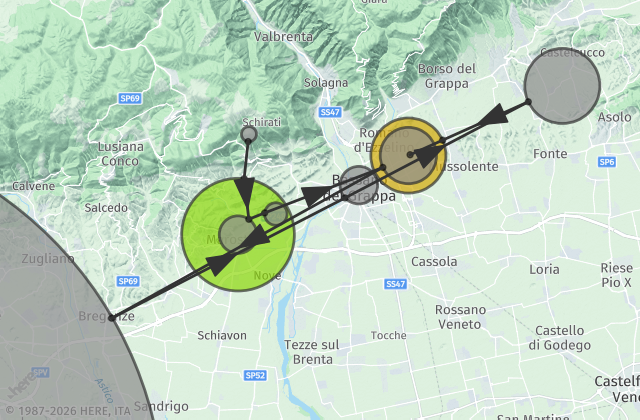 From Udine/Trieste follow A4/E70, take the A28 exit toward Portogruaro/Pordenone, take the exit onto A27 toward Venezia, take exit Treviso Nord, continue onto Superstrada Pedemontana Veneta, take the exit Bassano Est - Rosà and proceed north on SS47